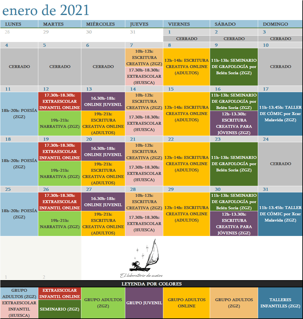 Fundada en 2017. Espacio creativo para escribir y soñar. Metodología basada en técnicas de creatividad. Talleres en nuestra aula de Zaragoza o donde desees nuestros servicios (bibliotecas, centros de enseñanza, casas de juventud, ayuntamientos, asociaciones culturales…).