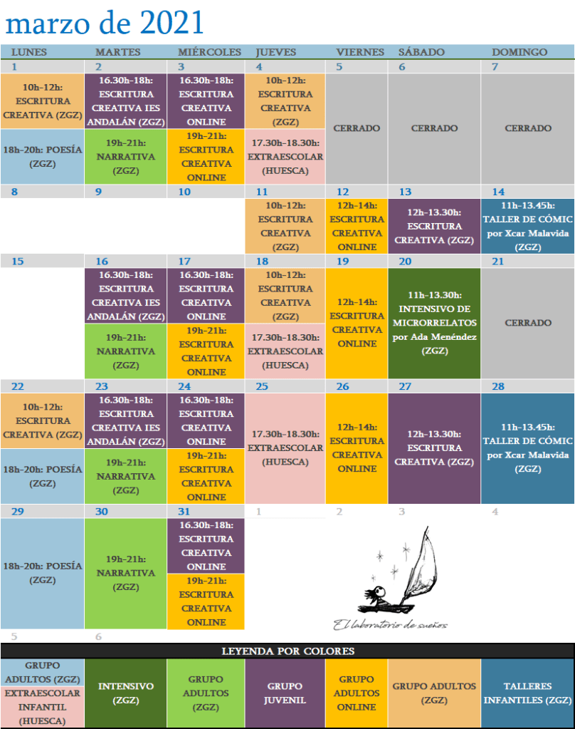 Fundada en 2017. Espacio creativo para escribir y soñar. Metodología basada en técnicas de creatividad. Talleres en nuestra aula de Zaragoza o donde desees nuestros servicios (bibliotecas, centros de enseñanza, casas de juventud, ayuntamientos, asociaciones culturales…).