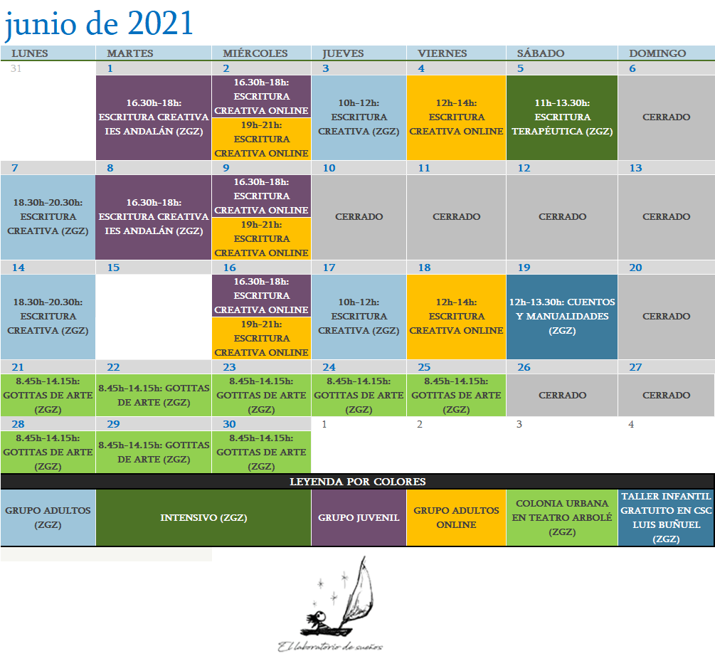 Fundada en 2017. Espacio creativo para escribir y soñar. Metodología basada en técnicas de creatividad. Talleres en nuestra aula de Zaragoza o donde desees nuestros servicios (bibliotecas, centros de enseñanza, casas de juventud, ayuntamientos, asociaciones culturales…).